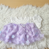 The set features a sweet white top with delicate ruffled sleeves and a charming tie detail at the neckline. Layered over the top is a dreamy dress in soft shades of light and darker purple, adorned with whimsical sheer floral appliques in white and a lovely light blue. The flowy skirt creates a magical look perfect for any special occasion or simply adding a touch of sweetness to her day. Completing the set are matching white bloomers to keep your little one comfortable. This outfit is crafted for comfort and style, making your baby girl look and feel like a little flower fairy.