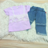 Dainty and delightful! ✨ This lovely set features a soft lavender top adorned with beautiful white lace tiers, paired with comfy denim-look capri pants with frayed details.